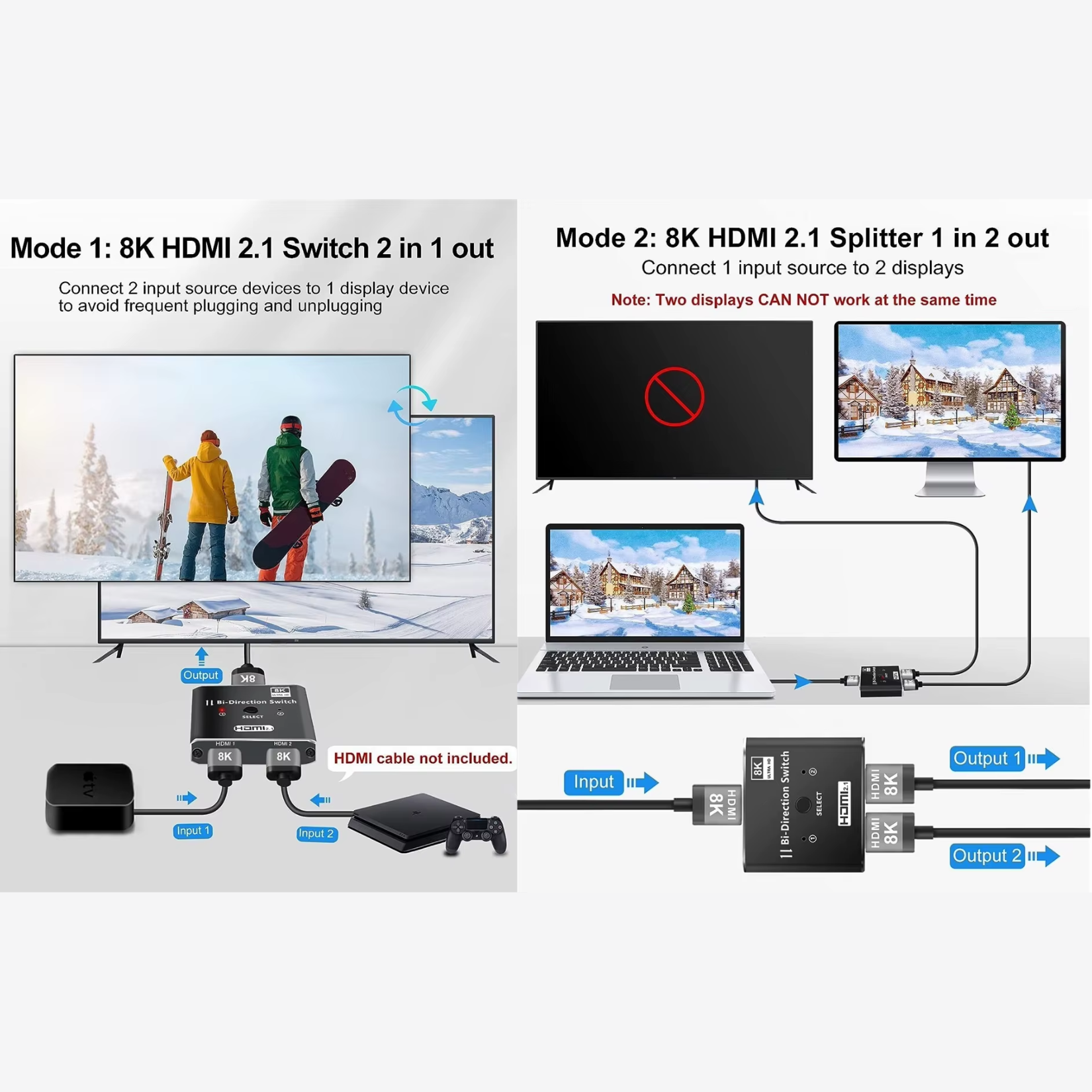 Als splitter (1-in-2): Verbind één HDMI-bron met twee schermen (beeld wordt afwisselend weergegeven, niet gelijktijdig).