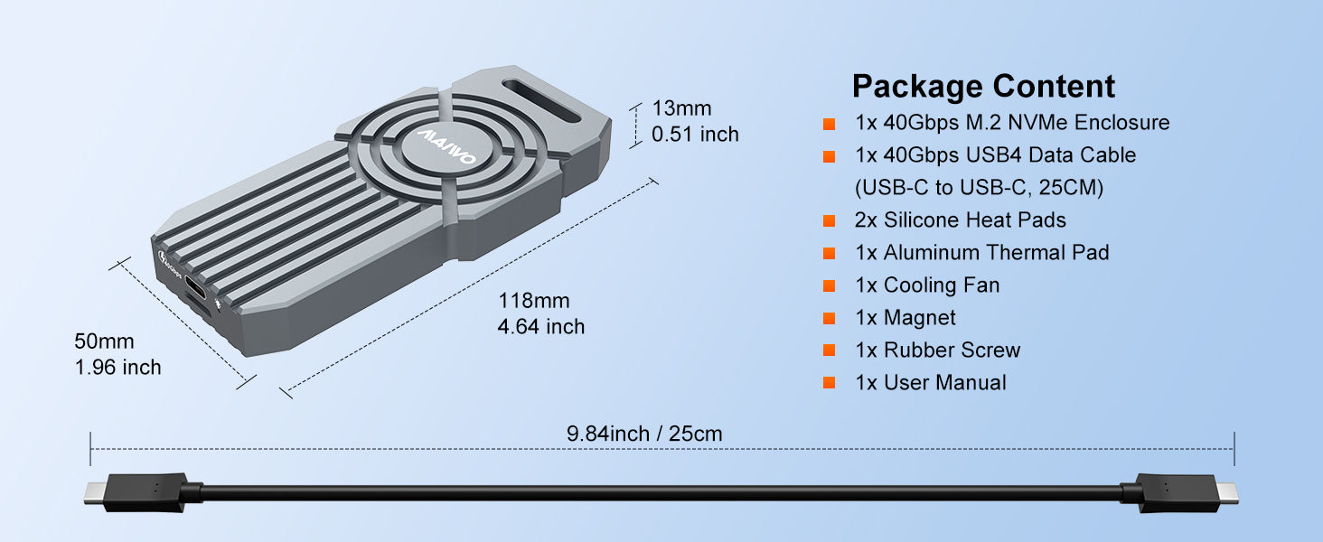 Upgrade je opslag met de MAIWO Externe Behuizing (K1719), een krachtige oplossing voor het snel en efficiënt aansluiten van een M-key of B+M-key NVMe 2280 SSD op je laptop, pc, tablet of Chromebook. Deze externe kast ondersteunt USB4 Type-C voor gegevensoverdracht tot 40 Gbps, waardoor je profiteert van de snelst mogelijke prestaties bij het verplaatsen van grote bestanden of het uitvoeren van zware applicaties.