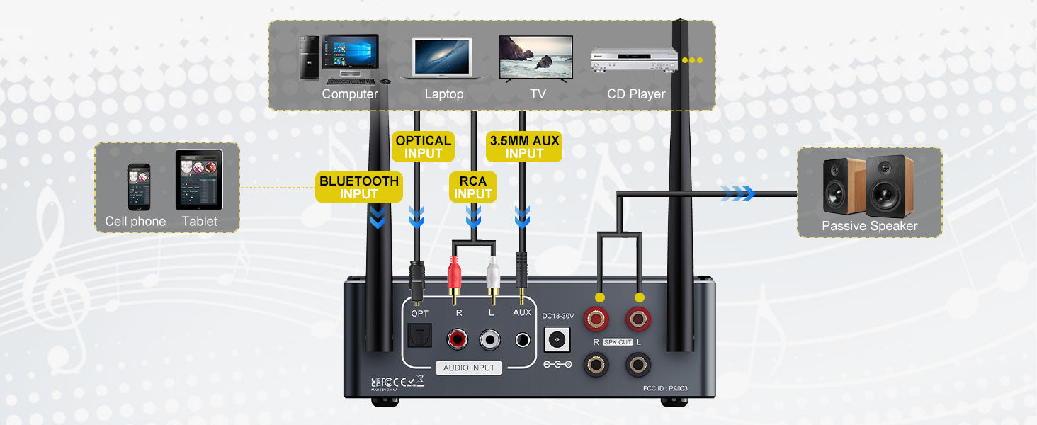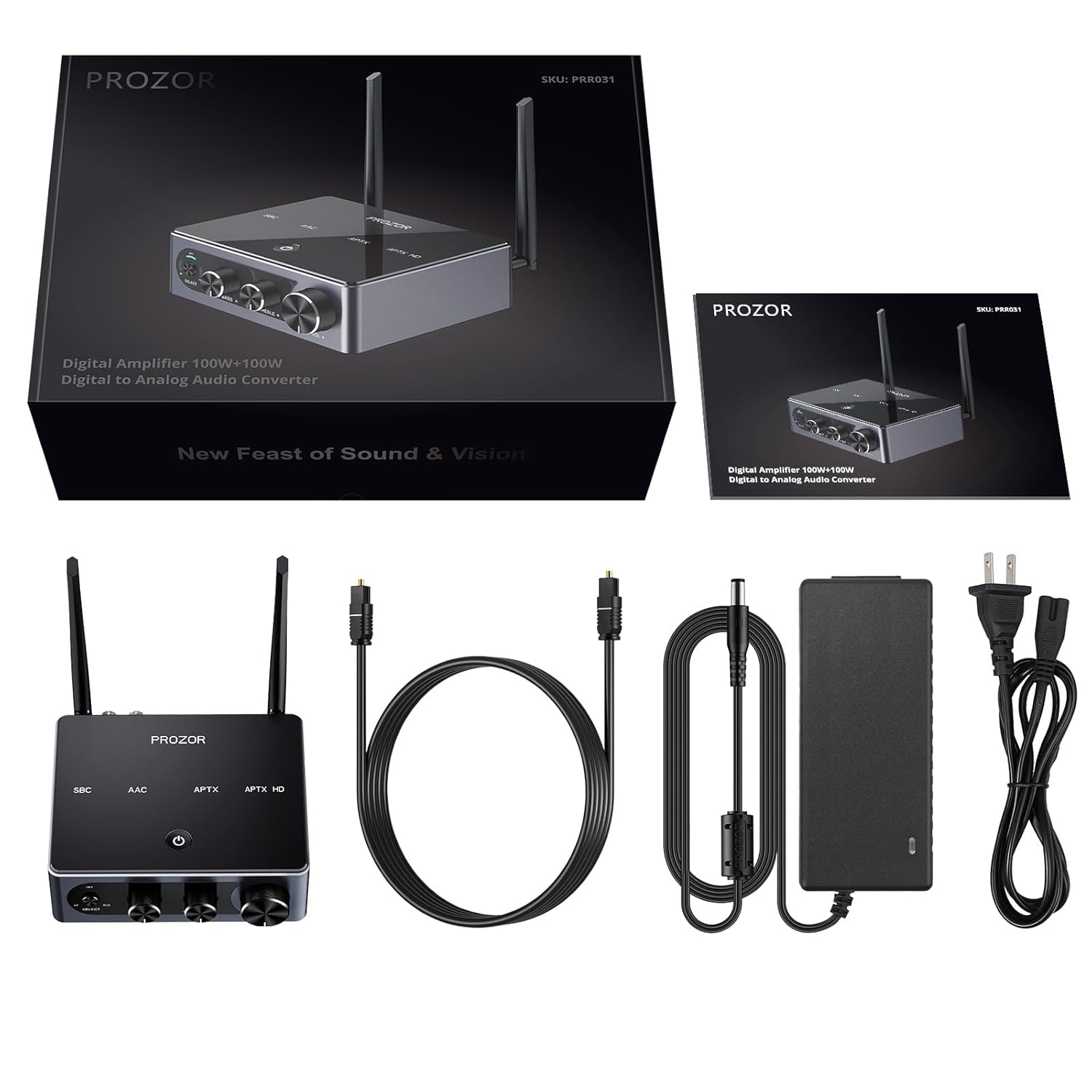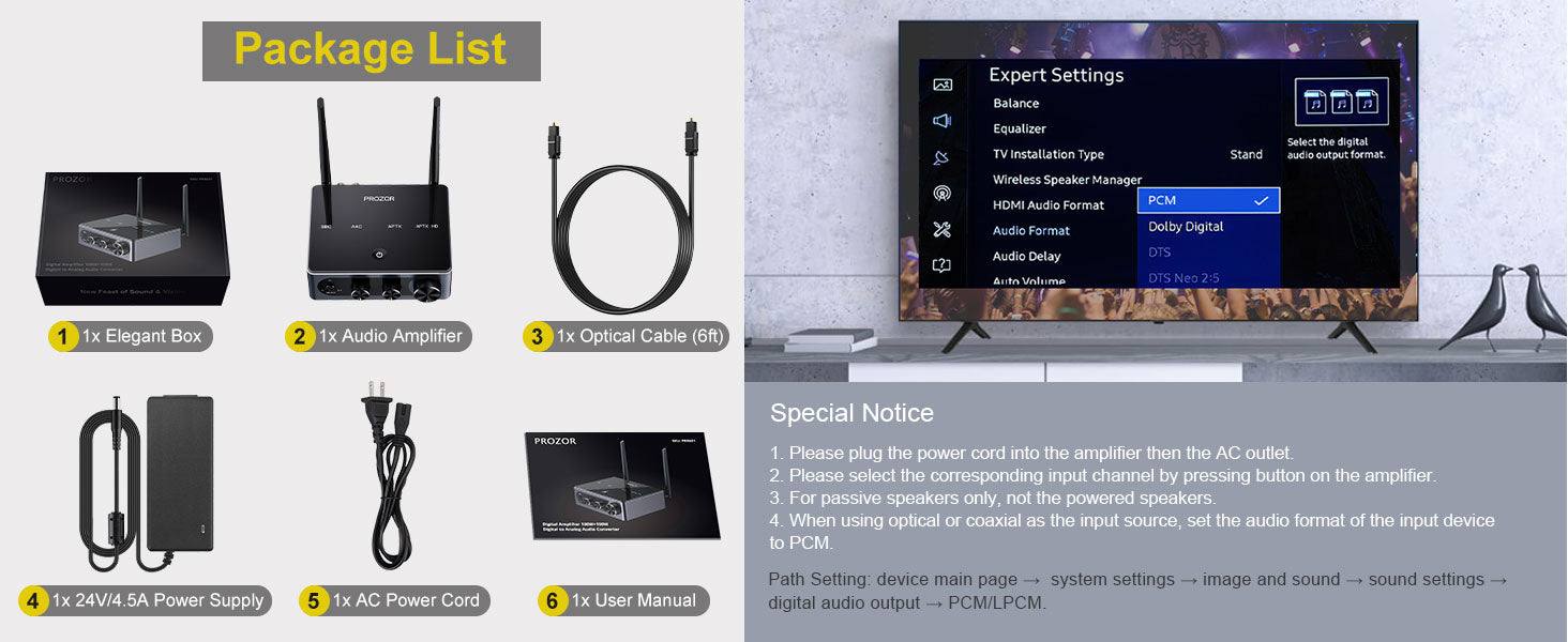Ondanks de krachtige interne chipset heeft de versterker een compact en stijlvol ontwerp dat in elk interieur past. De set wordt zeer compleet geleverd, inclusief een krachtige 24V-voeding en een optische kabel, zodat u direct na ontvangst kunt genieten van een hoogwaardige luisterervaring.