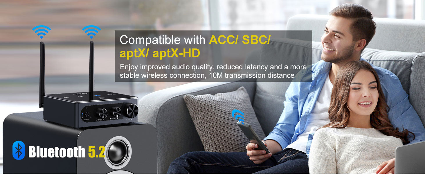 Met de fysieke regelaars voor bas en hoge tonen (treble) past u de audio-ervaring volledig aan uw persoonlijke voorkeur en de akoestiek van de ruimte aan. De nieuwste Bluetooth 5.2 technologie zorgt voor een stabiele, draadloze verbinding met een groot bereik en minimale vertraging. Daarnaast biedt het apparaat diverse bekabelde opties zoals optisch (ideaal voor TV), RCA en AUX, waardoor het de centrale hub van uw audiosysteem wordt.