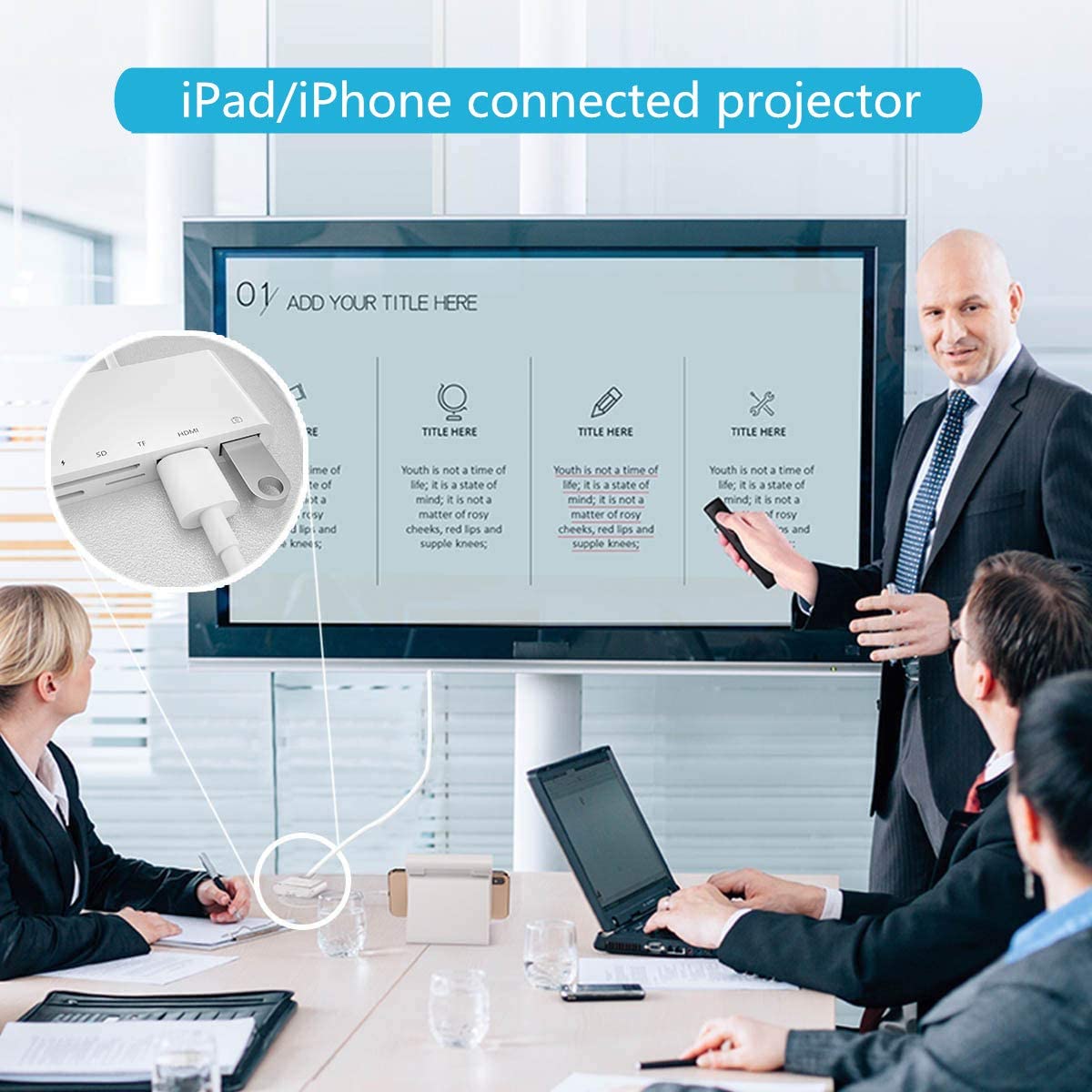- Ingang: HDMI-poort, USB A 3.1-poort, Lightning-poort en TF/SD Kaartlezer