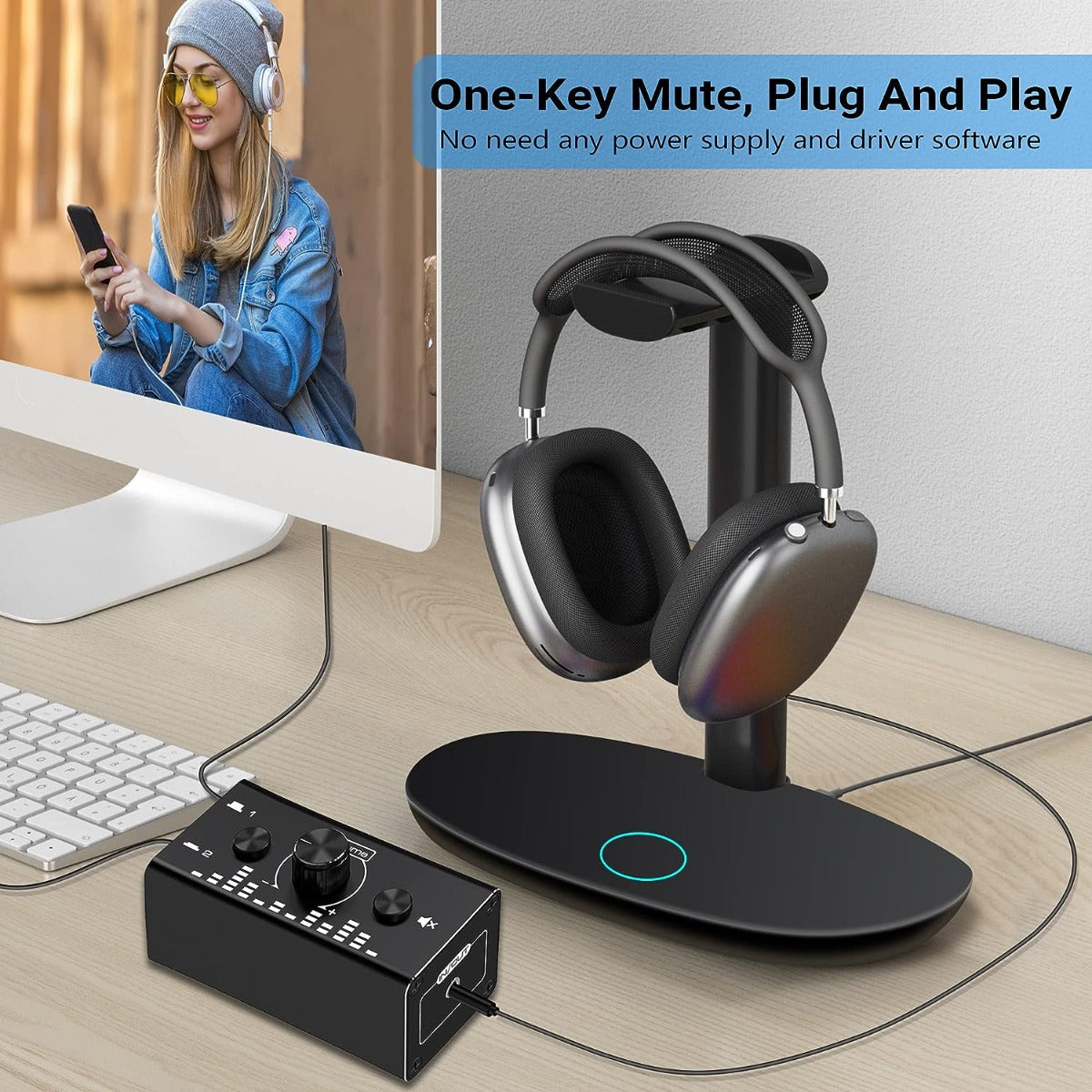 - Eenvoudige Bediening: Met een eenvoudige knop op de schakelaar kun je snel kiezen welke geluidsbron actief moet zijn. De schuifregelaar voor volumeregeling maakt het mogelijk om het volume naar wens aan te passen, terwijl de "mute-knop" je in staat stelt om het geluid onmiddellijk te dempen wanneer dat nodig is.