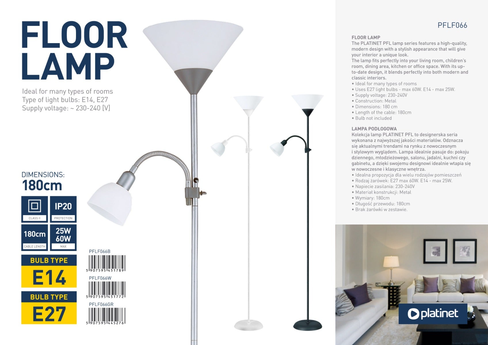 Platinet PFLF066B Moderne vloerlamp - E27 max 2x 60W Gloeilamp - E14 max 25W Leeslamp - Zwart