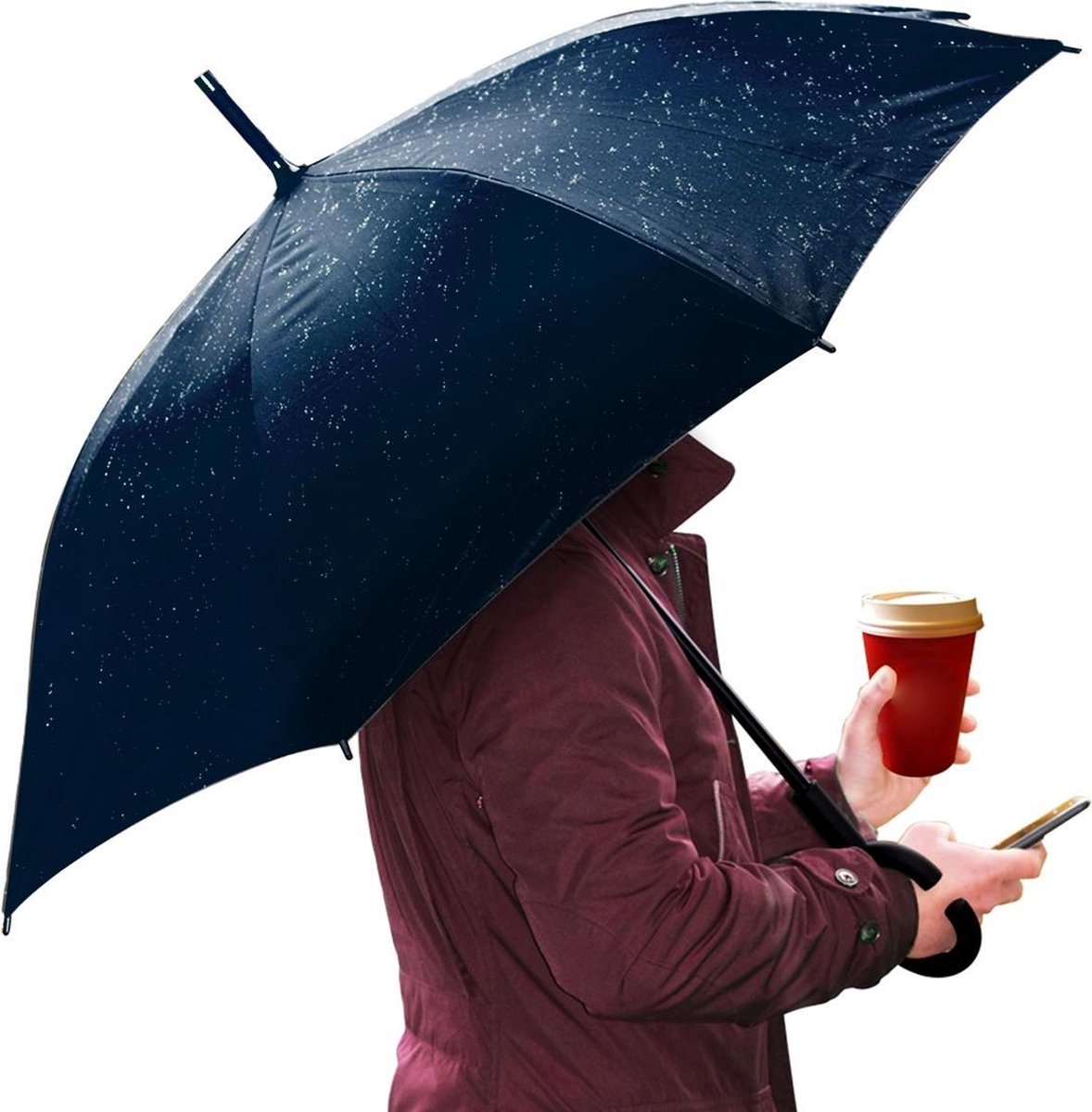 Paraplu met een C-vormig handvat waarmee u uw smartphone kunt gebruiken.